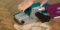 - 1С помощью машины барабанного типа проводится первичная (грубая) шлифовка наждачной лентой или бумагой с зернистостью 24-80. Так с поверхности пола удаляется старый верхний слой.